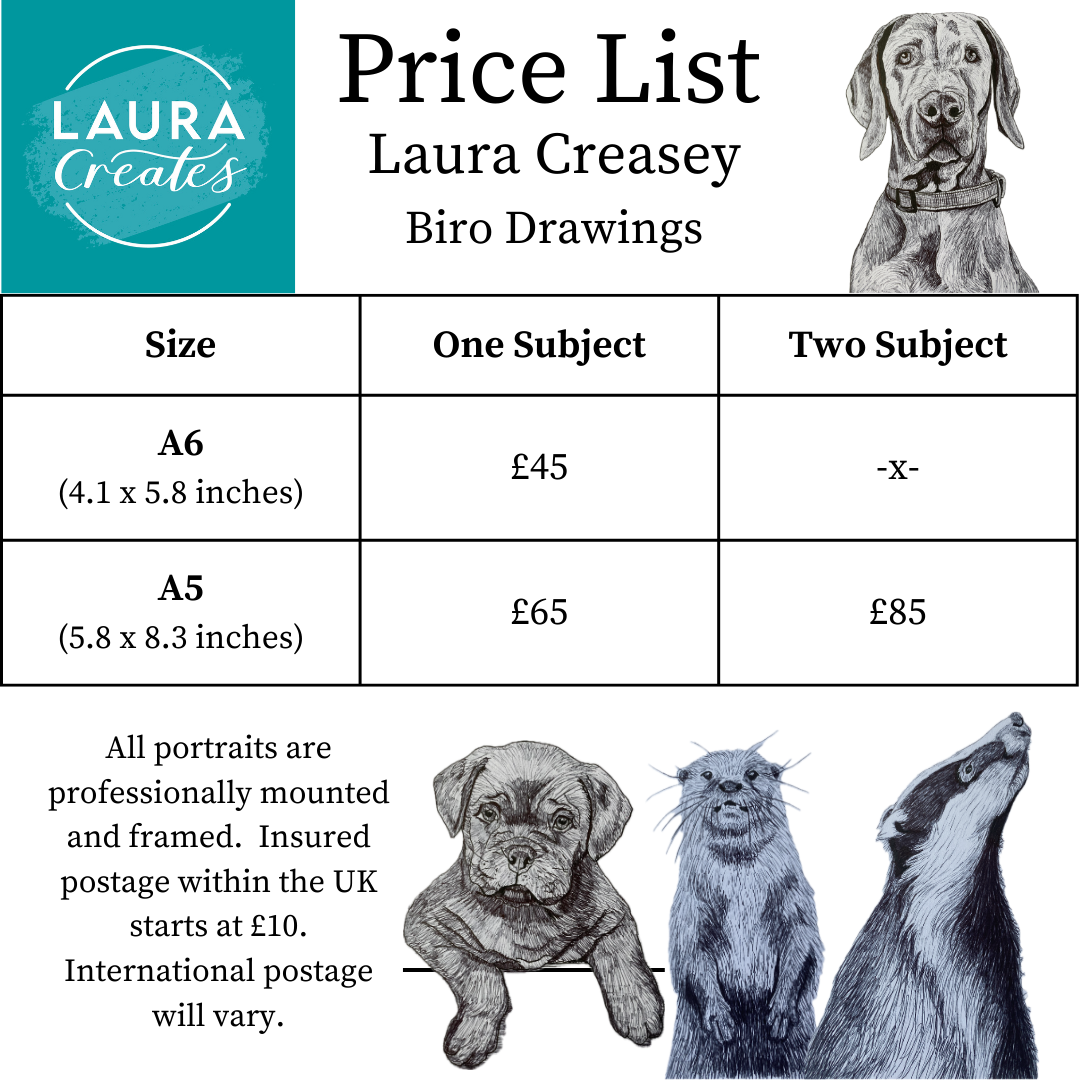 Mounting and Framing: All my commissions come mounted in a white mount and framed as standard. I usually used wooden style frames but if you would like an alternative colour we will be able to discuss this prior to booking your portrait.