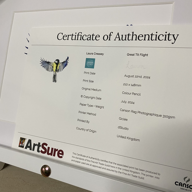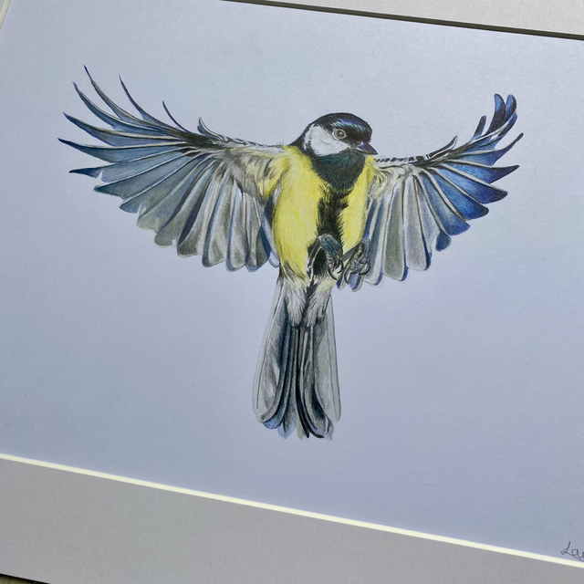 Introducing the 'Great Tit Flight' giclée fine art print, printed on premium Canson Rag Photograpique 310gsm paper. This stunning print captures all the intricate details of the original A5 colour pencil drawing, allowing you to enjoy the artwork in all its glory. Hand-signed and accompanied by a certificate of authenticity, this print is a true collector's item. The small size is approximately A5 and comes mounted to 10 x 8 inches. Whether you're a bird lover, art enthusiast, or simply want to add a touch of beauty to your home or office, the 'Great Tit Flight' print is a must-have.