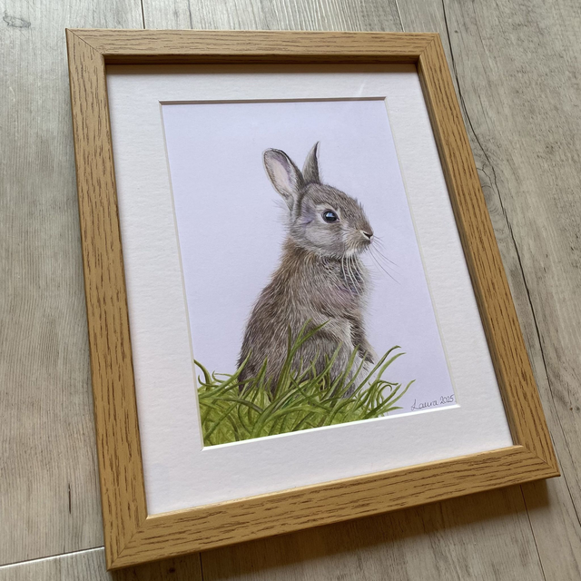 Add a touch of charm to any room with this beautifully detailed colour pencil drawing of a baby rabbit, expertly crafted on high-quality A5 paper. Perfectly capturing the delicate innocence of a kit, this artwork brings warmth and nature-inspired beauty to your space. The drawing is carefully mounted onto an 8 x 10 inch backing and presented in a stylish natural wood-effect external frame measuring approximately 9 x 11 inches, making it ready to hang or gift. Ideal for nurseries, children’s rooms, or as a thoughtful present for animal lovers, this framed piece combines artistry and elegance effortlessly. Enhance your décor with this unique, hand-finished baby rabbit illustration today!
